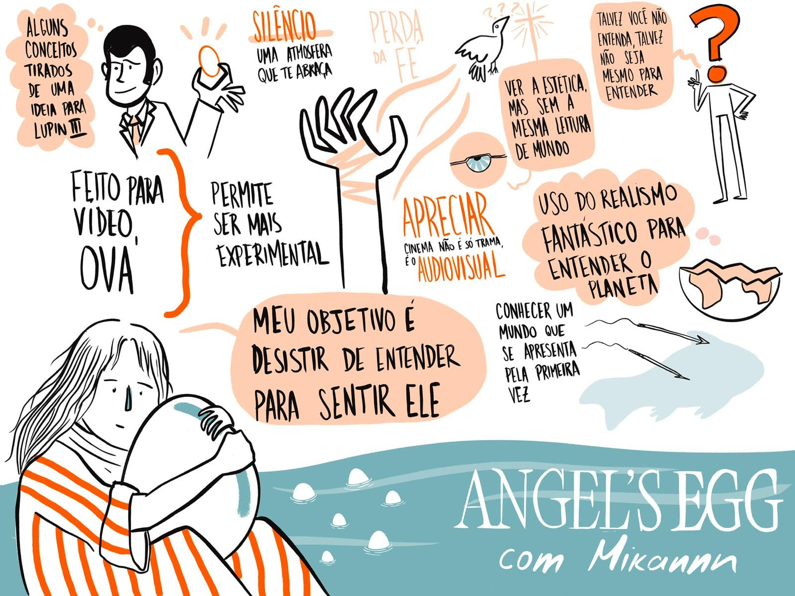 🌱 Totalmente viciada em fazer sessões-debate? Sim! Na edição passada, mencionei a sessão-debate de A Viagem de Chihiro que rolou comigo em SP. A experiência foi tão bacana que assumi mais duas sessões desde então! No começo do mês teve a de Perfect Blue, que mais uma vez contou com a facilitação gráfica do genial Vítor Massao. Fiz tantas anotações sobre a obra de Satoshi Kon que talvez venha aí um vídeo novo no canal - ou, ao menos, vários comentários aqui na newsletter. A próxima (que talvez já tenha rolado quando o post sair) é a pré-estreia de Angel's Egg, que chega aos cinemas mundiais em versão remasterizada. O filme é uma parceria do diretor Mamoru Oshii (Ghost in the Shell, Patlabor) e o artista Yoshitaka Amano (que, entre muitas coisas, é famoso pela arte conceitual de vários Final Fantasy). Além da empolgação pra ver o longa telona, estou super orgulhosa do projeto das sessões-debate. Se tudo der certo, quero participar de mais eventos do tipo - e não só em SP, então me convidem pra ir até a cidade de vocês ♥