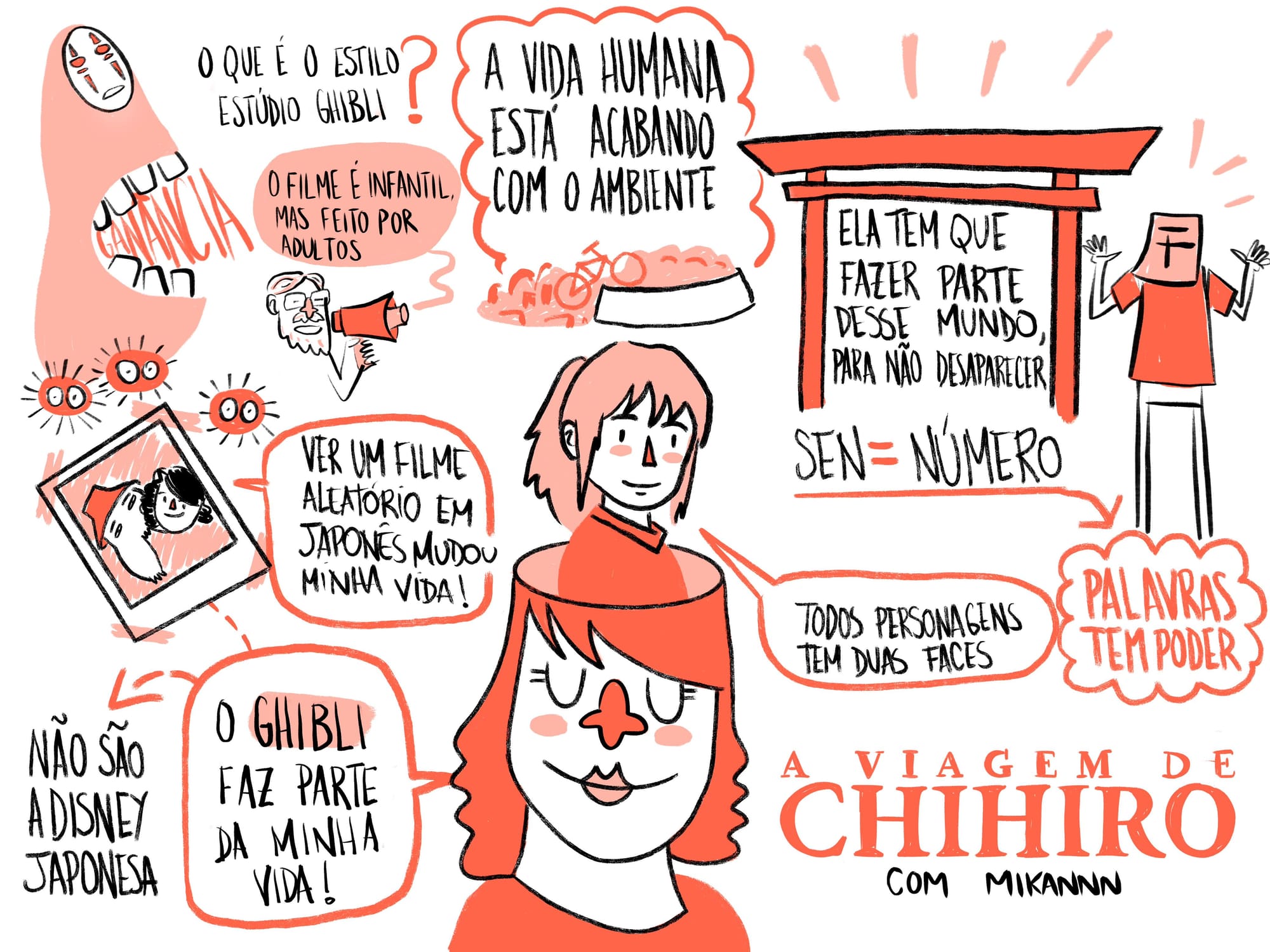 Pude participar de uma sessão-debate de A Viagem de Chihiro no Belas Artes do Shopping Frei Caneca e acho que foi um dos grandes momentos da minha carreira ♥ Mais de 20 anos depois de ir com a família ao cinema e ser arrebatada por esse filme, pude não só vê-lo em tela grande novamente (com a presença da minha família!), como também discutir essa obra-prima com dezenas de pessoas. Foi muito especial e espero poder organizar outras sessões no mesmo formato. Não tenho uma gravação do papo para compartilhar aqui, mas o Vítor Massao estava lá e registrou minha fala em forma de arte. Que honra!