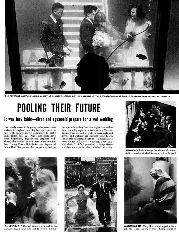 E uma das sereias até se casou sob as águas! A revista LIFE publicou em 1954 as fotos de um casamento entre a Aquamaid Mary Beth Sanger e o palhaço mergulhador Bob Smith. As filmagens da cerimônia foram usadas anos depois no clipe Dare to Be Stupid, do Weird Al Yankovic (dá pra ver entre 02:19 e 02:24). Mas pera... palhaço mergulhador? Será que descobrimos a identidade do Glurpo? Bem, uma de suas identidades, já que, assim como os mascotes da Disneylândia, qualquer um pode estar sob a fantasia.