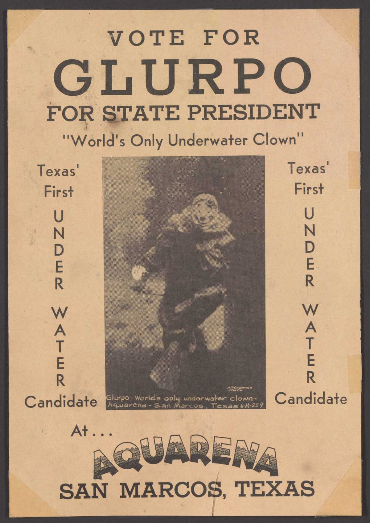 Sabemos que Glurpo foi interpretado por várias pessoas porque, nesse artigo do Texas Monthly, eles entrevistam outro Bob, dessa vez de sobrenome Phillips, que interpretou o palhaço nos anos 1960. O artigo mostra como, ao lado do porquinho Ralph e das Aquamaids, Glurpo se tornou um ícone texano. Apareceu na TV, em capa de revista e até como candidato eleitoral de mentirinha (meio na vibe do Macaco Tião aqui no Brasil, sabe?). Também conta que um rosto por trás da Glurpette foi o de Shirley Rogers, filha do fundador do parque, que originalmente trabalhava como Aquamaid. Quando a demanda do público por palhaços (???) se tornou maior do que podiam atender com os poucos funcionários homens, ela decidiu vestir a máscara e se tornou a versão feminina. Além dela, havia o Bublio, uma espécie de ajudante do Glurpo. Era toda uma família de palhaços subaquáticos, o combo perfeito para quem sofre de coulrofobia e talassofobia.